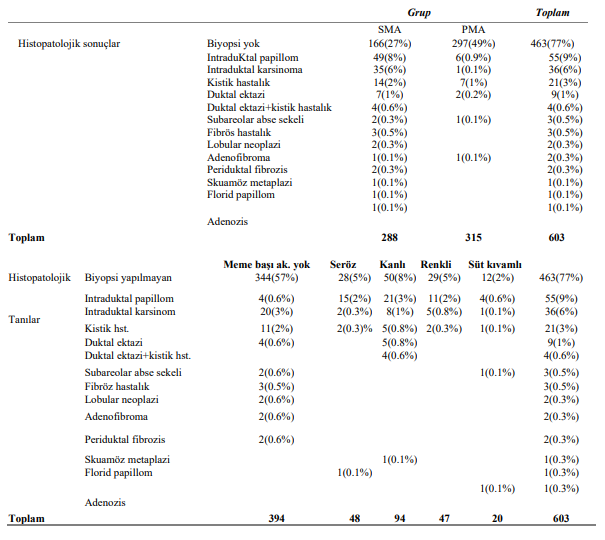 Tablo 1. Meme başı akıntısı nedeniyle başvuran ve biyopsi/subareolar eksplorasyon yapılan hastalarda elde edilen histopatolojik inceleme sonuçları.akıntı karakteri seröz-renkli-kanlı-süt kıvamında olabilir. (SMA: spontan meme başı akıntısı, PMD: provoke meme meme başı akıntısı). (B.Ü.T.F. Dr.Hüsnü Göksel serisi)